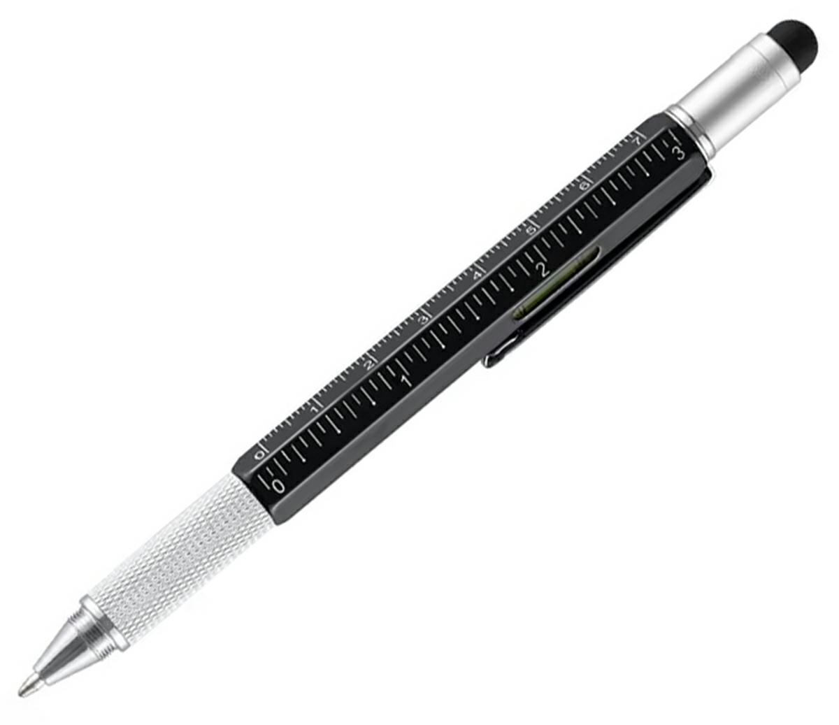 Długopis wielofunkcyjny – multitool 6w1. Gadżet został wyposażony w wiele przydatnych drobiazgów takich jak rysik do ekranów dotykowych, poziomica, miarka, śrubokręt oraz schowek na drobiazgi. Doskonale sprawdzi się przy klasycznej pracy biurowej jak również podczas majsterkowania.