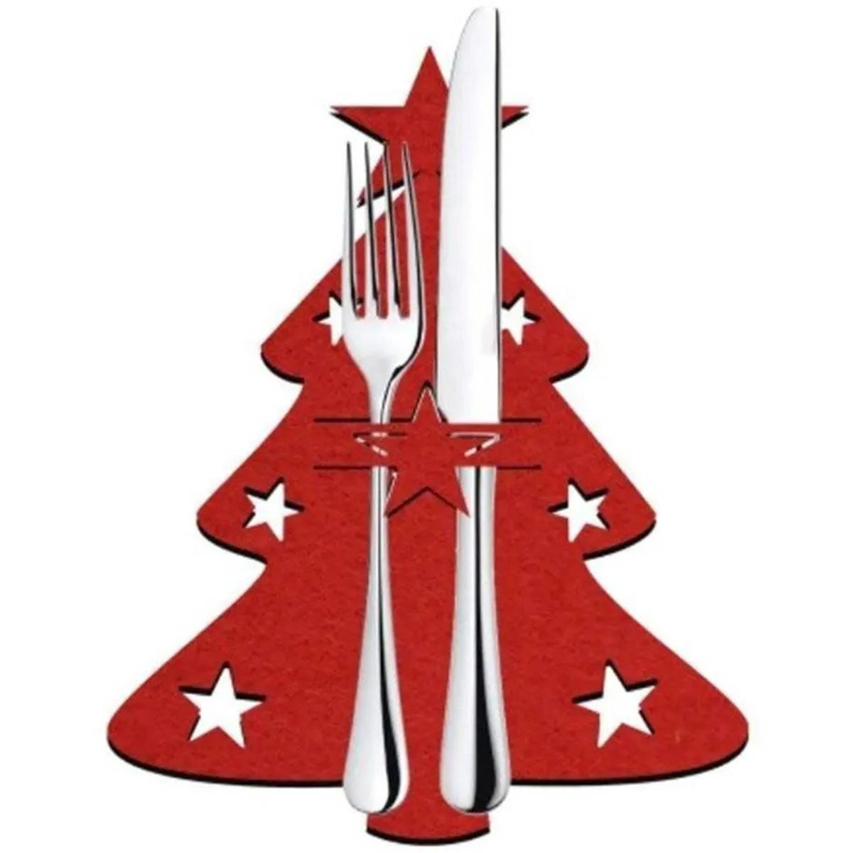 Kieszonka na sztućce w kształcie choinki. Doskonały pomysł na ozdobienie świątecznego stołu. Świetnie sprawdzi się jako dekoracja na Boże Narodzenie. Estetyczne wykonanie i wycięcia w formie gwiazdek. Produkt wykonany z miękkiego, przyjemnego w dotyku filcu, który nie ślizga się po stole.