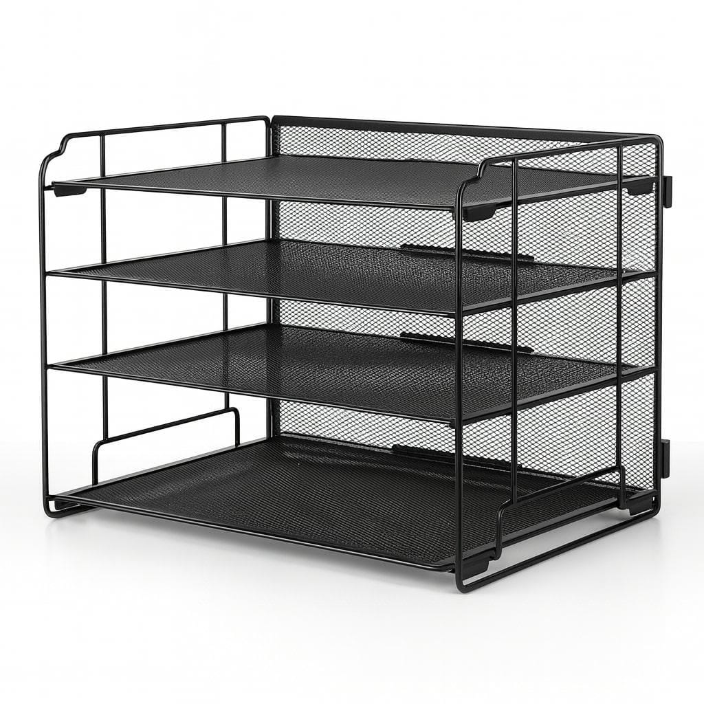 Metalowy organizer biurkowy w kolorze czarnym to praktyczne rozwiązanie do przechowywania dokumentów i akcesoriów biurowych. Pomaga utrzymać porządek i lepszą organizację miejsca pracy. Dzięki 4 pojemnym półkom oraz dodatkowej tacce wszystkie ważne materiały będą zawsze pod ręką.