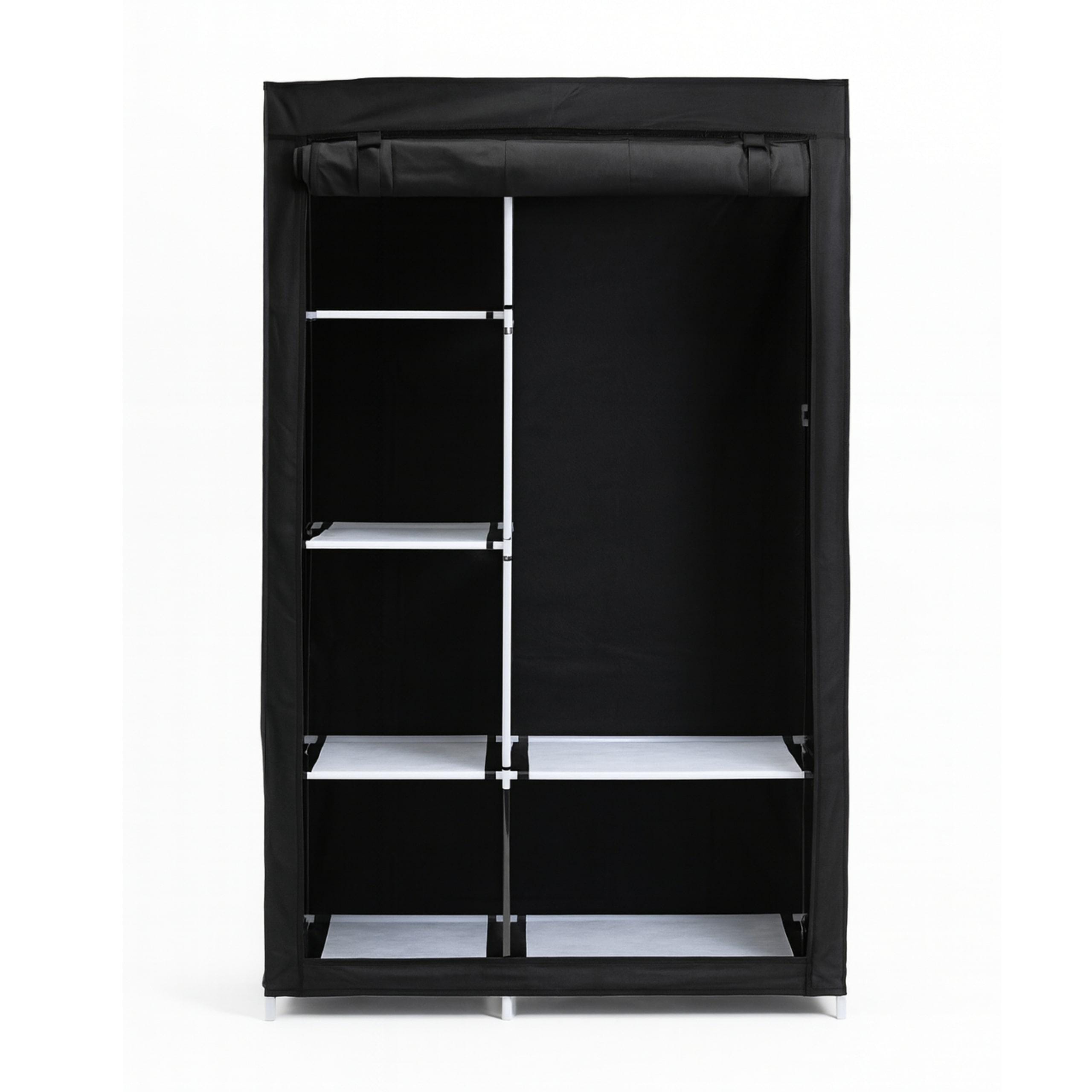 Ta czarna tekstylna szafa to idealny wybór dla osób poszukujących praktycznego, lekkiego i pojemnego mebla. Sprawdzi się jako dodatkowe miejsce do przechowywania odzieży, zapewniając wygodną organizację i estetyczne wykończenie.