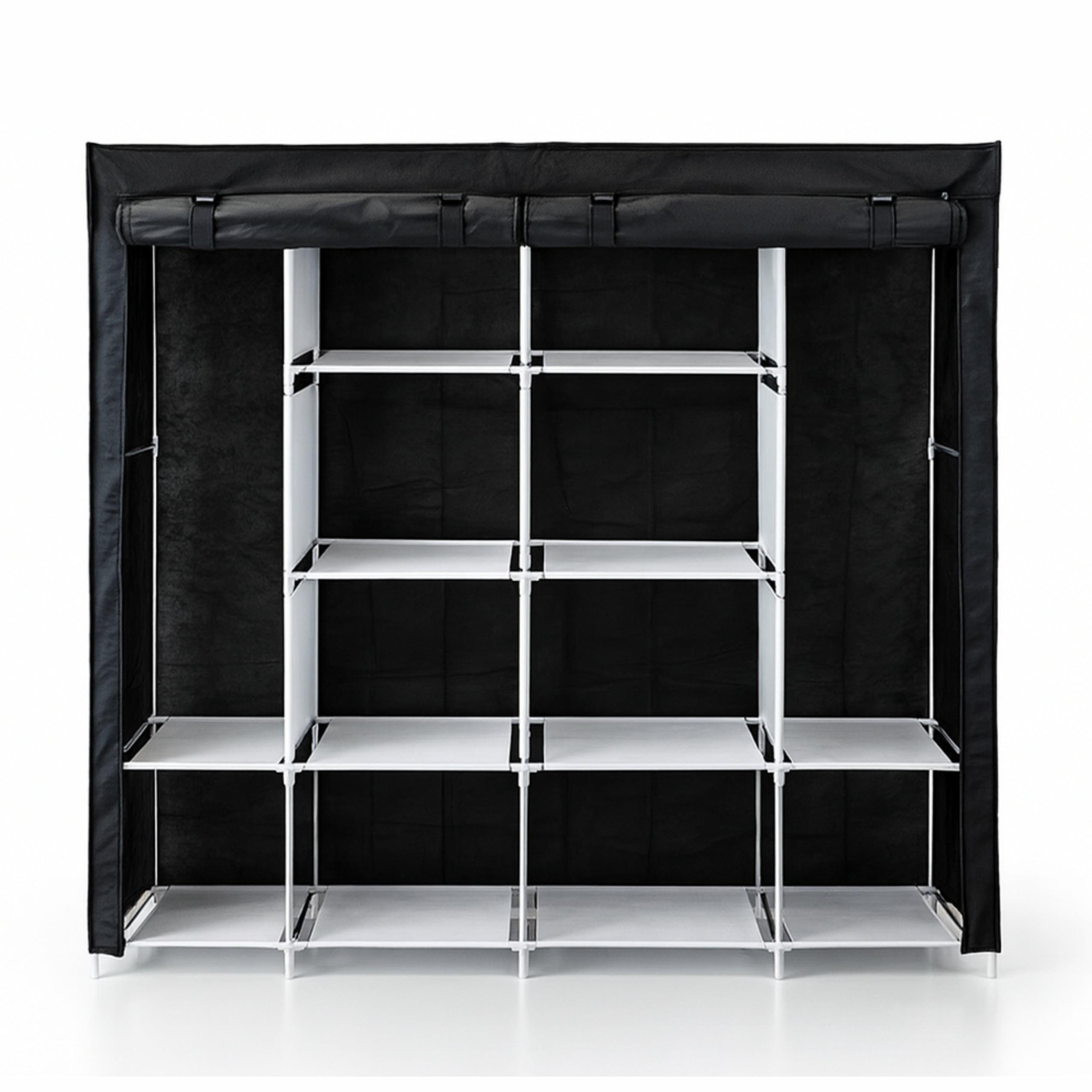 Duża szafa materiałowa w kolorze czarnym to funkcjonalne, pojemne i lekkie rozwiązanie organizacyjne do każdej przestrzeni — sypialni, garderoby, biura czy pokoju dziecięcego. Stabilna konstrukcja z metalowych rurek oraz trwały pokrowiec chronią odzież przed kurzem, a liczne półki, wieszaki i kieszenie boczne pozwalają na wygodne rozłożenie wszystkich elementów garderoby. Szafa łączy dużą pojemność z estetycznym wyglądem i łatwym montażem.