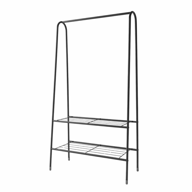 Praktyczny wieszak stojący zaprojektowany z myślą o funkcjonalnym przechowywaniu ubrań w domu, biurze lub lokalu usługowym. Solidna konstrukcja z lakierowanego metalu zapewnia stabilność i trwałość, a minimalistyczny design doskonale wpisuje się w nowoczesne wnętrza. Wieszak posiada drążek na wieszaki oraz dwie praktyczne półki, idealne na buty, kosze, akcesoria lub torebki.