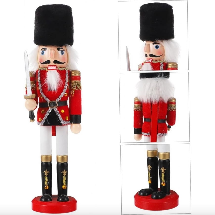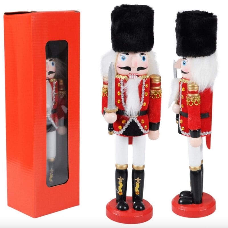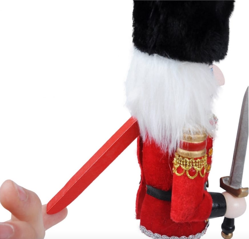 Figurka posiada szczegóły takie jak wełniana broda i miecz, które dodają jej charakteru. Z tyłu figurki znajduje się dźwignia, która pozwala dziadkowi poruszać szczękami, co umożliwia rozłupywanie orzechów laskowych. Dziadek do orzechów doskonale sprawdzi się jako centralny element świątecznej dekoracji, zarówno w domu, jak i w restauracjach, hotelach czy sklepach.