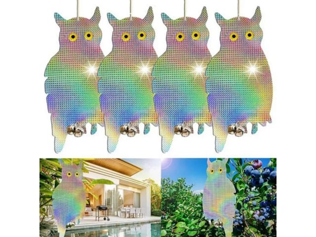 • Odstraszacz ptaków w kształcie sowy wykonany z odblaskowego materiału holograficznego, który skutecznie odstrasza ptaki takie jak gołębie, szpaki i inne.