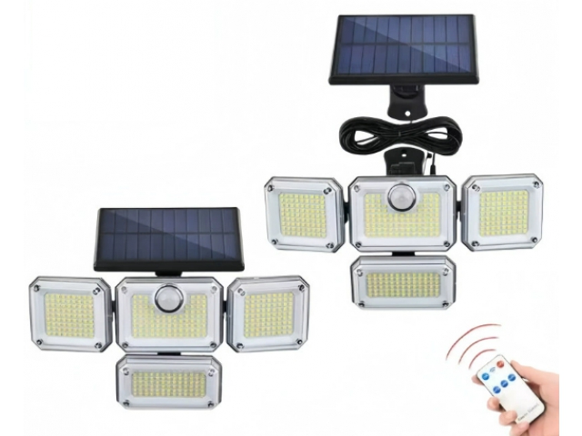 Zewnętrzna lampa solarna wyposażona w 333 diody LED rozmieszczone w czterech niezależnych modułach świetlnych, które można ustawić pod różnymi kątami, aby oświetlić większą powierzchnię wokół domu.