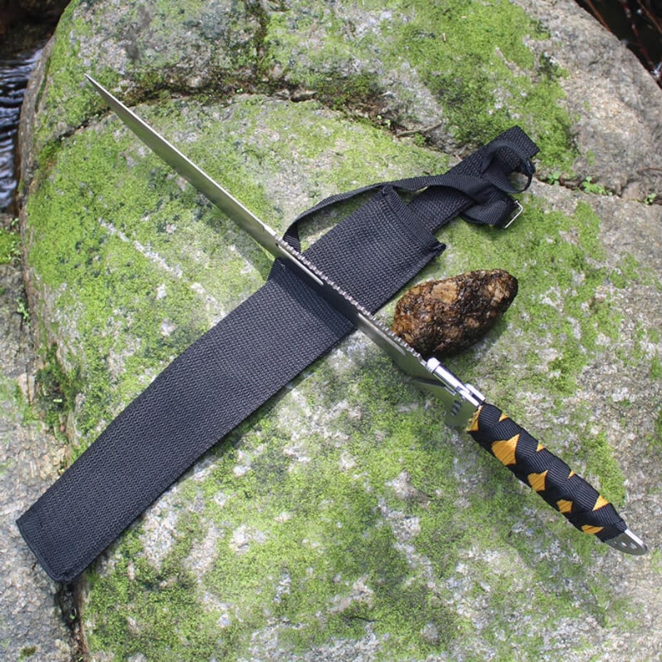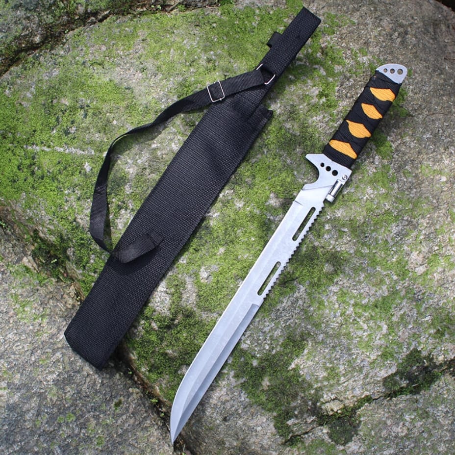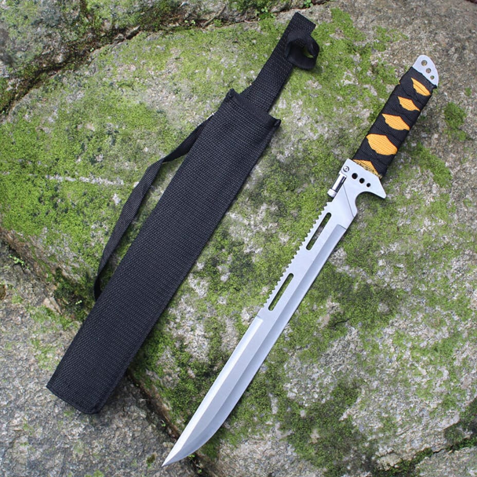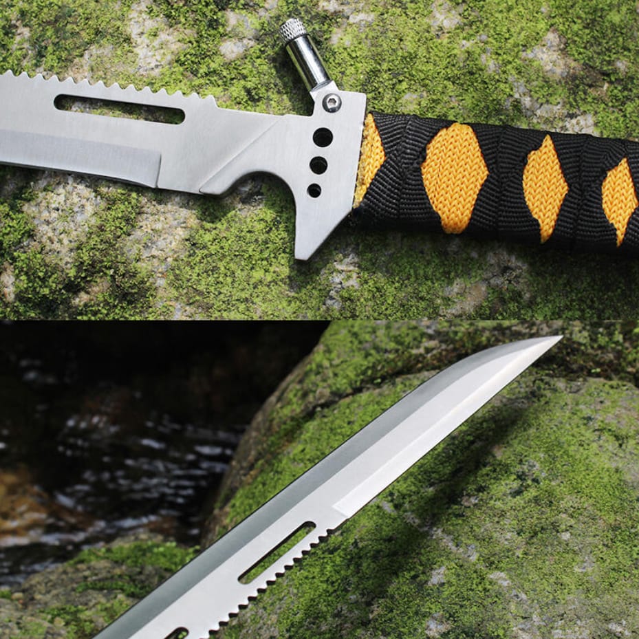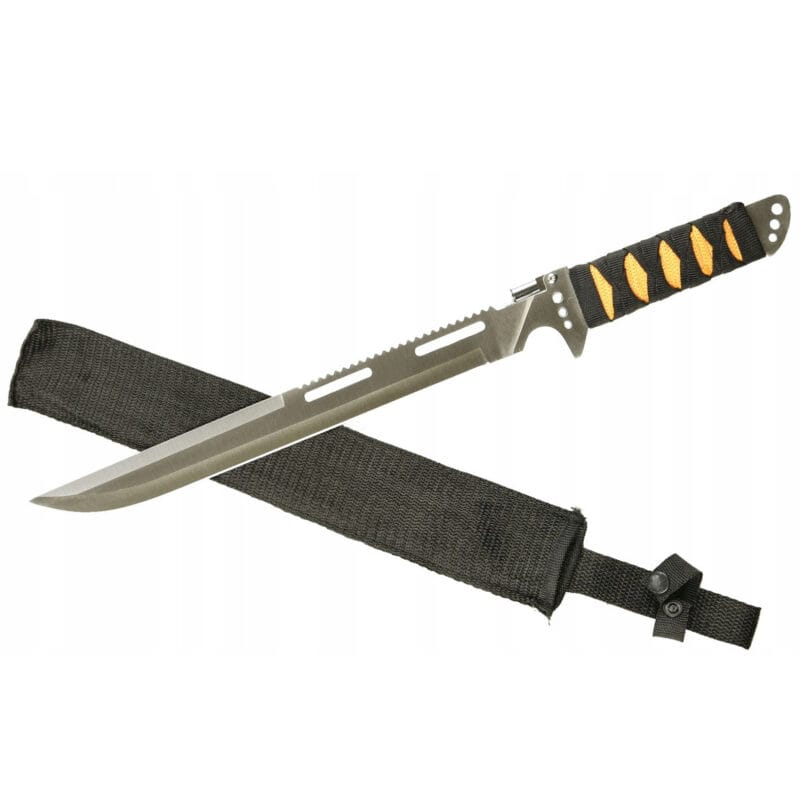 Taktyczny nóż wojskowy typu maczeta o długości 48 cm to wyjątkowo solidne i funkcjonalne narzędzie stworzone z myślą o wymagających użytkownikach. Wykonany z jednego kawałka stali, z wbudowaną piłą i latarką na grzbiecie głowni, sprawdzi się w najtrudniejszych warunkach survivalowych. Rękojeść z wytrzymałym oplotem gwarantuje pewny chwyt, a całość zapakowana jest w trwały pokrowiec z cordury.