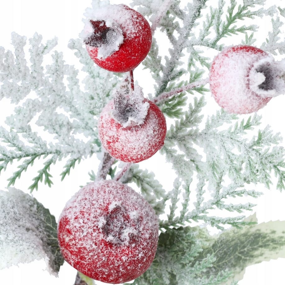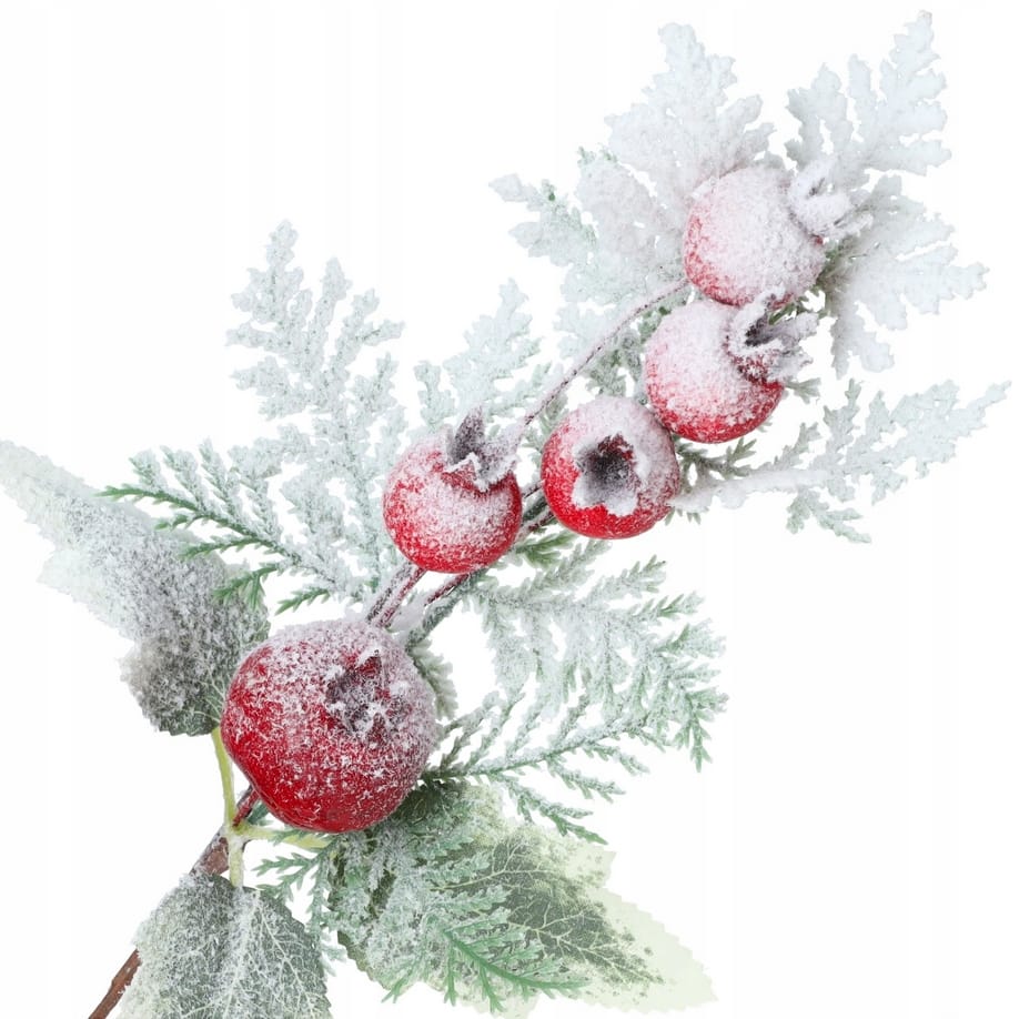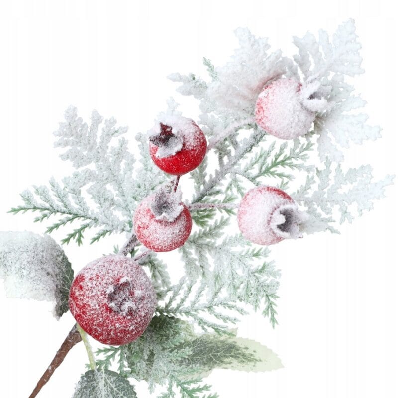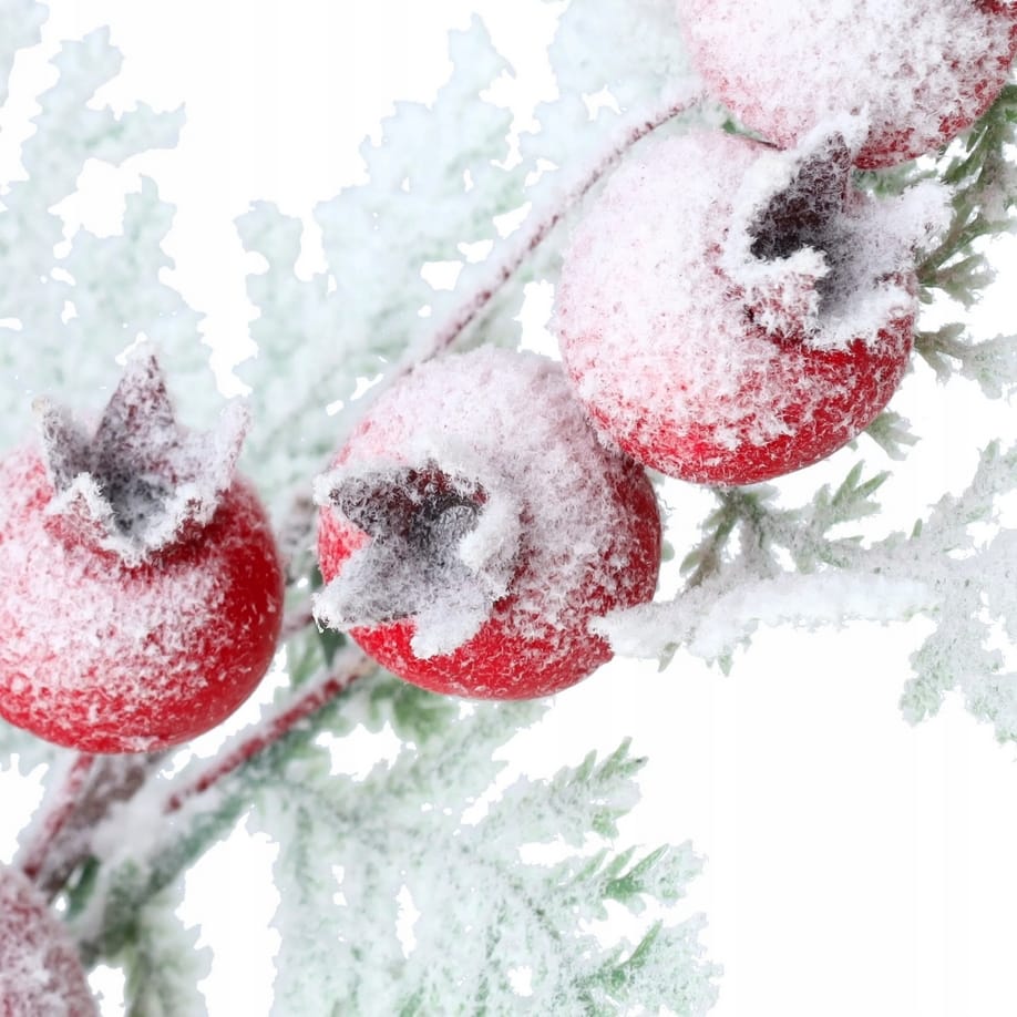 Ośnieżona gałązka świąteczna to elegancki i subtelny dodatek do bożonarodzeniowych dekoracji, który wprowadza naturalny, zimowy akcent. Idealnie sprawdzi się jako element stroików, wieńców czy innych kompozycji DIY. Gałązka ozdobiona jest trzema liśćmi oraz pięcioma owocami głogu – jednym większym i czterema mniejszymi – co nadaje jej autentycznego wyglądu. Delikatny efekt szronu dodaje uroku i sprawia, że dekoracja prezentuje się wyjątkowo stylowo.