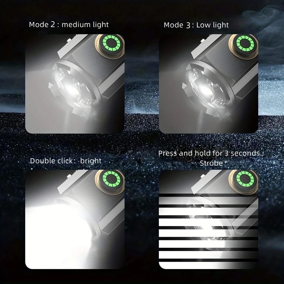Latarka posiada 5 trybów pracy (silny/średni/niski/migający/super), zmienia się je poprzez przyciśnięcie przycisku znajdującego się na korpusie latarki.