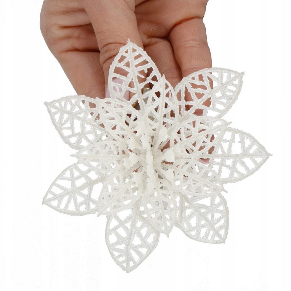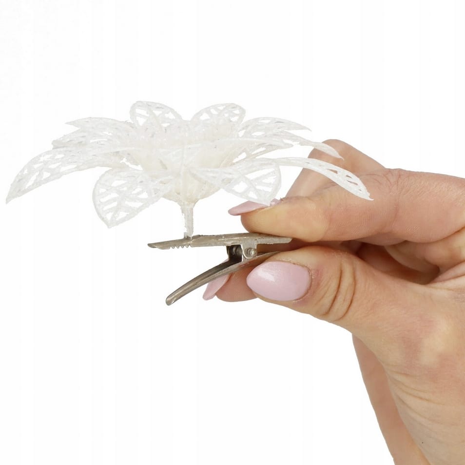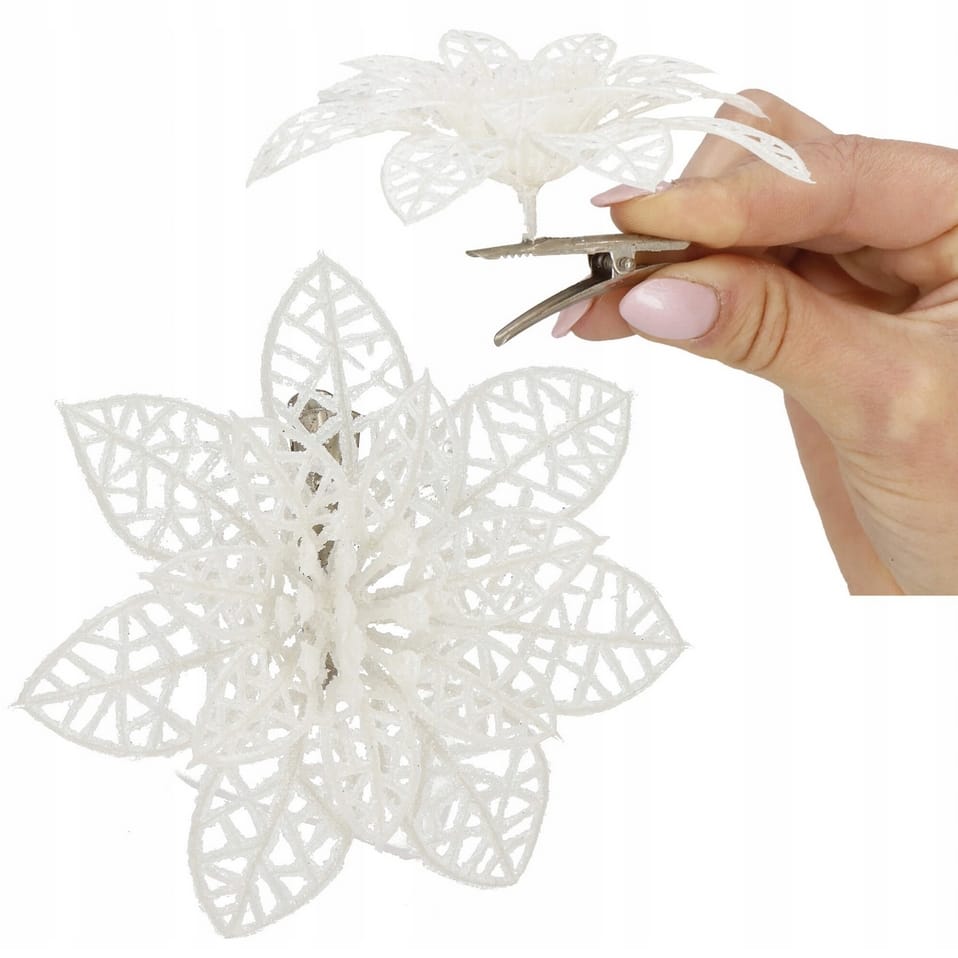 Biała gwiazda betlejemska to eleganczna ozdoba świąteczna, która wprowadza do wnętrza klasyczny, zimowy klimat. Doskonale sprawdzi się jako dekoracyjny akcent w stroikach, na choince, girlandach, lampionach czy w kompozycjach florystycznych. Realistyczne detale, subtelna kolorystyka i staranne wykonanie sprawiają, że kwiat prezentuje się bardzo naturalnie. Dzięki praktycznemu klipsowi mocowanie jest szybkie i łatwe, a trwałe tworzywo pozwala na wielokrotne wykorzystanie dekoracji.