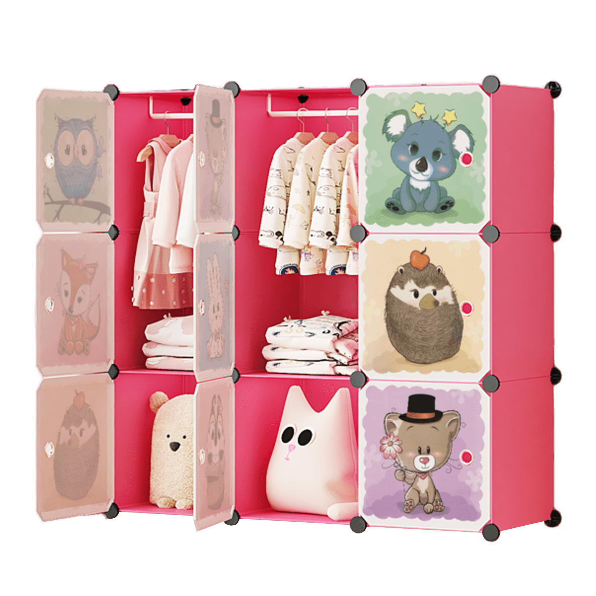 Modułowa szafa z 9 różowych segmentów to praktyczne i stylowe rozwiązanie do przechowywania butów, zabawek, ubrań czy drobnych przedmiotów. Dzięki nowoczesnej konstrukcji idealnie sprawdzi się w garderobie, przedpokoju, pokoju dziecka czy łazience. Lekka, ale stabilna, pozwala na dowolne łączenie modułów w większe układy, dopasowane do dostępnej przestrzeni. Zamykane drzwiczki skutecznie chronią zawartość przed kurzem, jednocześnie dbając o estetykę wnętrza.