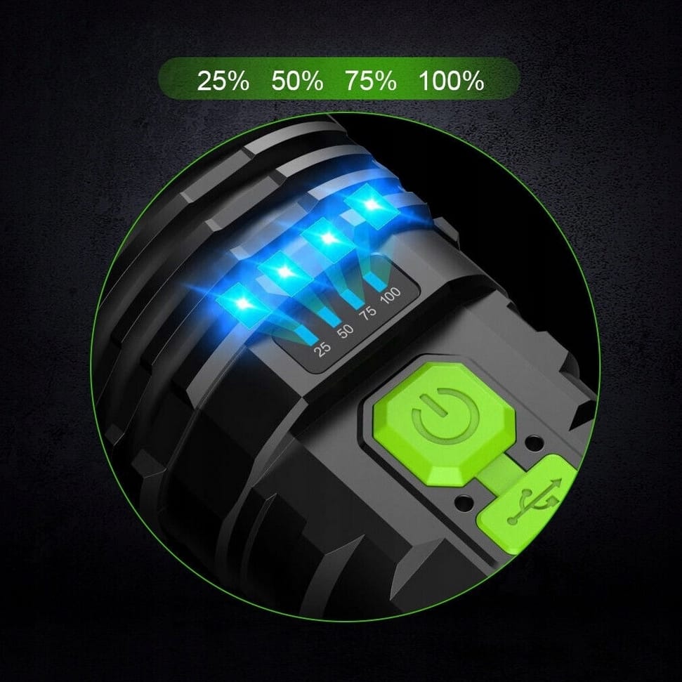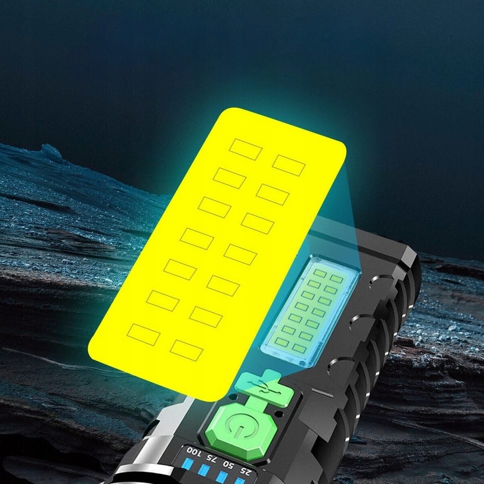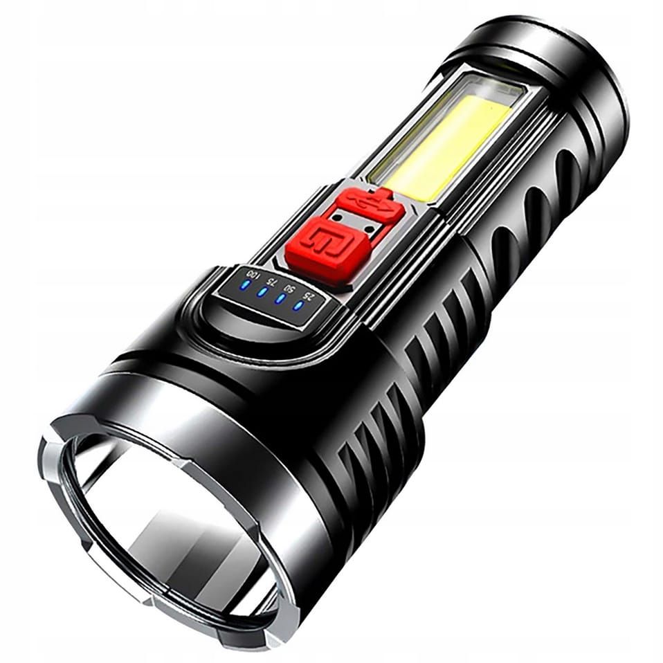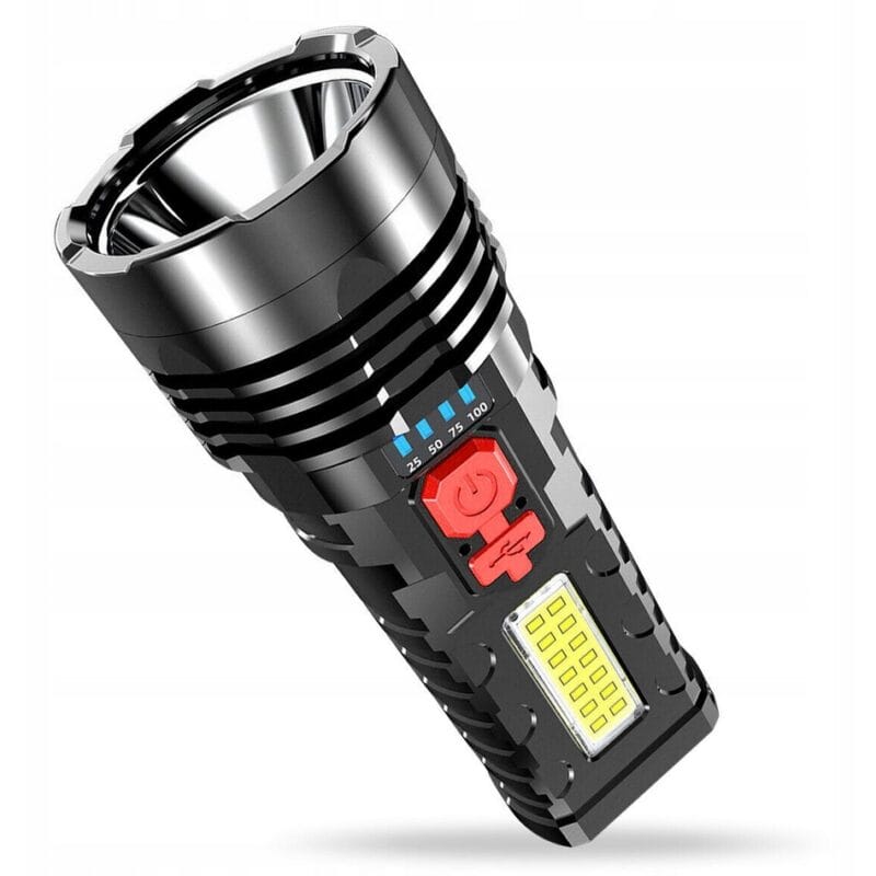 Latarka akumulatorowa LED to wielofunkcyjne urządzenie stworzone do intensywnego użytkowania w trudnych warunkach. Wykonana z wytrzymałego materiału ABS, zapewnia odporność na deszcz, wstrząsy oraz ekstremalne temperatury. Posiada wbudowany akumulator 18650, który umożliwia długotrwałe użytkowanie i ładowanie za pomocą dołączonego kabla USB z różnych źródeł, takich jak powerbanki, komputery czy radia samochodowe. Wskaźnik naładowania informuje o stanie baterii, a dodatkowa dioda COB służy do oświetlania większych powierzchni. Latarka oferuje cztery tryby świecenia: pełne 100%, oszczędne 50%, pulsacyjne oraz boczne oświetlenie COB, co czyni ją niezwykle wszechstronną.