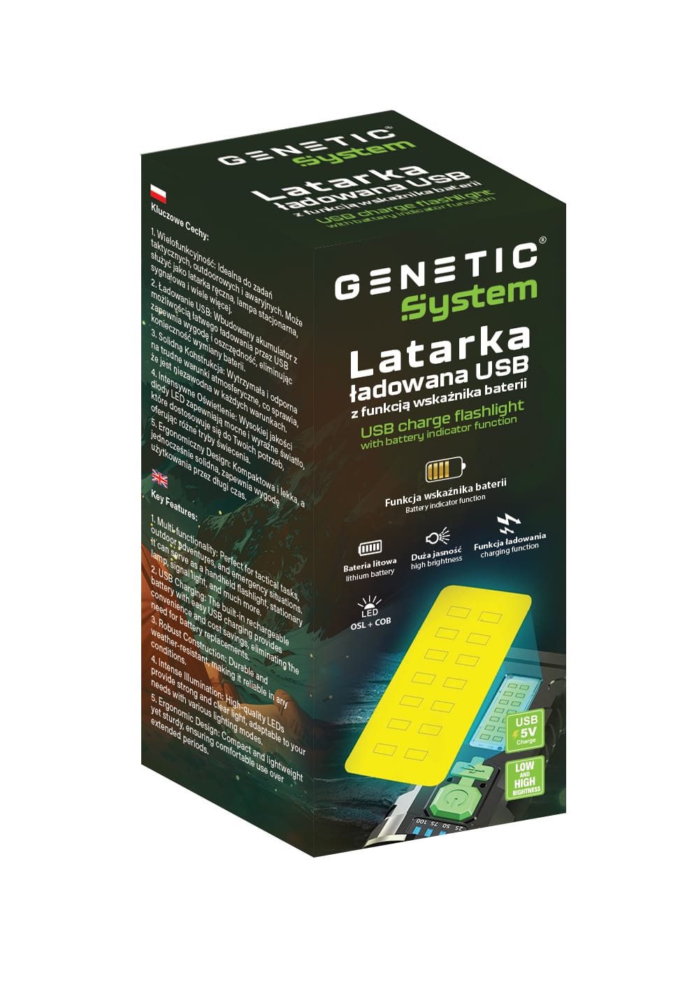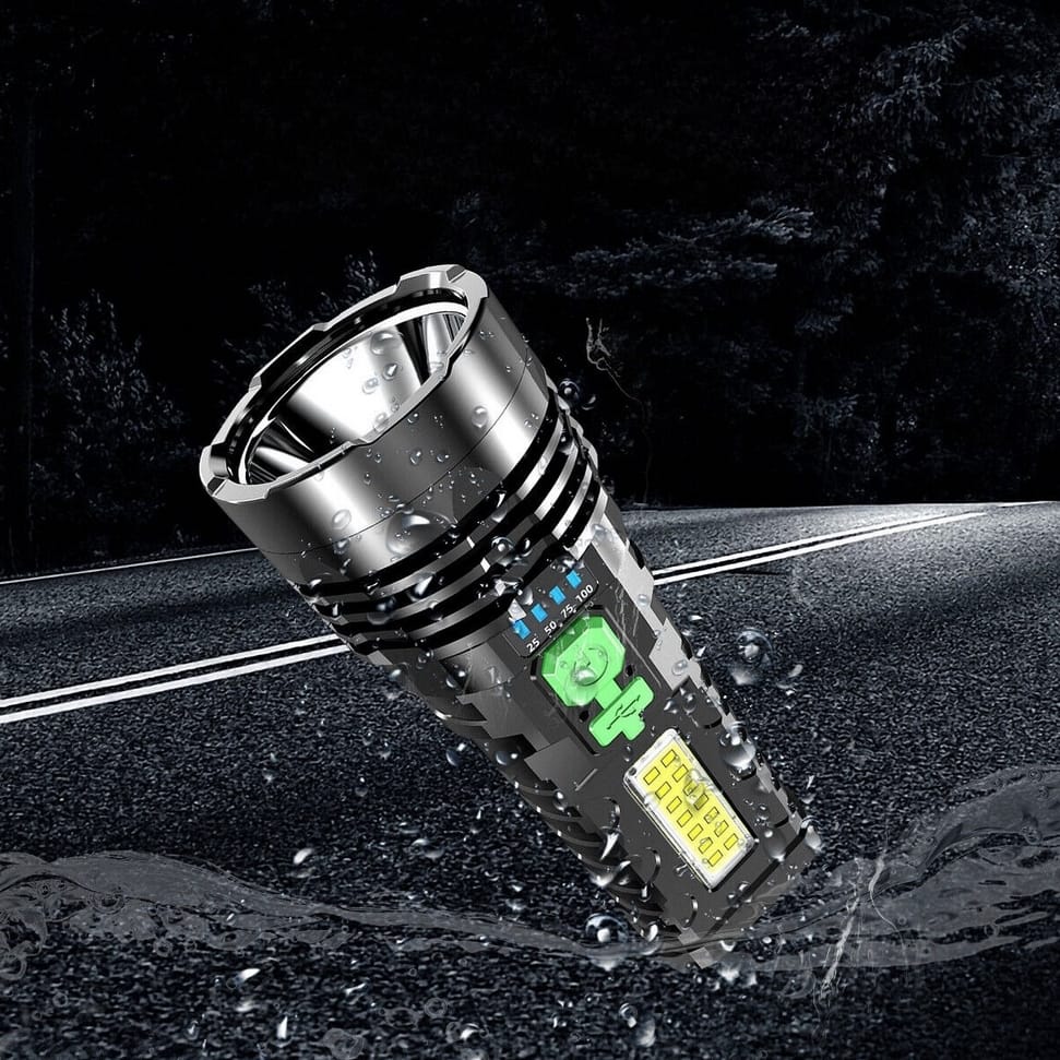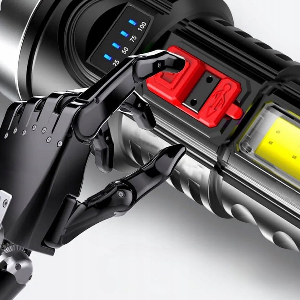 Latarka akumulatorowa LED to wielofunkcyjne urządzenie stworzone do intensywnego użytkowania w trudnych warunkach. Wykonana z wytrzymałego materiału ABS, zapewnia odporność na deszcz, wstrząsy oraz ekstremalne temperatury. Posiada wbudowany akumulator 18650, który umożliwia długotrwałe użytkowanie i ładowanie za pomocą dołączonego kabla USB z różnych źródeł, takich jak powerbanki, komputery czy radia samochodowe. Wskaźnik naładowania informuje o stanie baterii, a dodatkowa dioda COB służy do oświetlania większych powierzchni. Latarka oferuje cztery tryby świecenia: pełne 100%, oszczędne 50%, pulsacyjne oraz boczne oświetlenie COB, co czyni ją niezwykle wszechstronną.