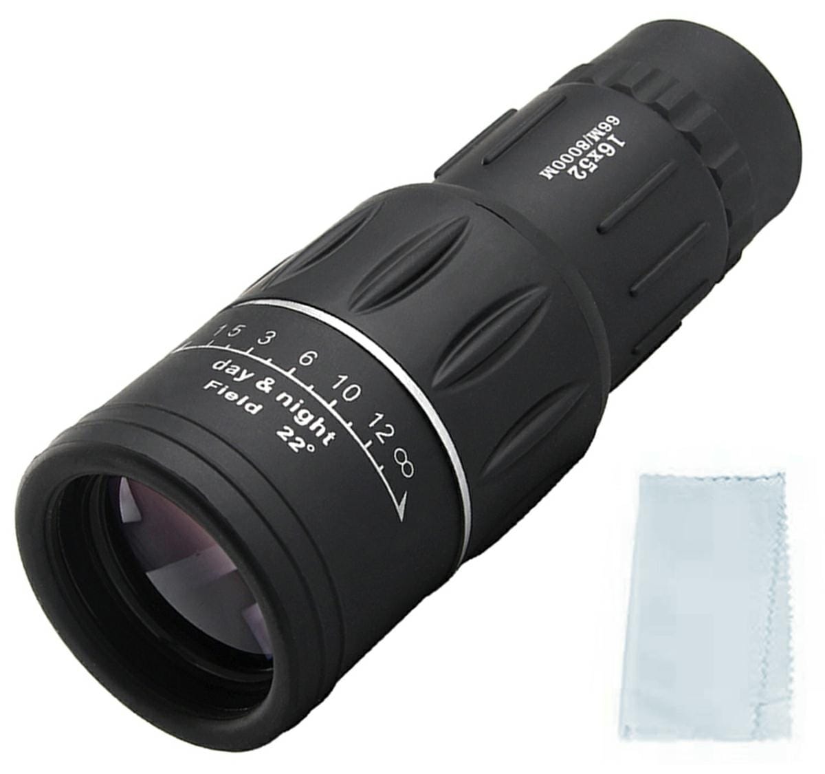 Kieszonkowy monokular – lornetka ze szklaną optyką. To najmniejszy z teleskopów o tak dużym powiększeniu (x16) dostępnych na rynku. Produkt wyposażony został w soczewkę o szerokim polu widzenia (od 66 do nawet 8000 m). Możliwość korzystania zarówno w dzień jak i w nocy (warstwa antyodblaskowa). W zestawie dodatkowy pokrowiec oraz pasek.