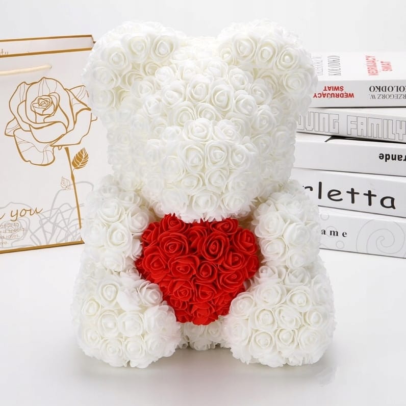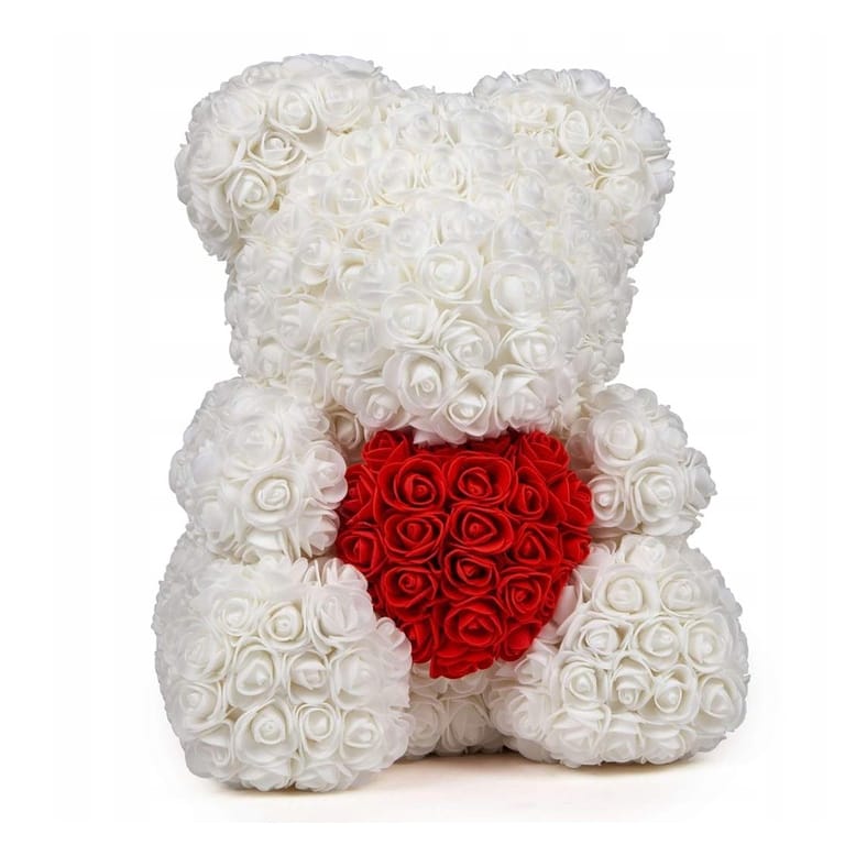 • Miś z białych róż z sercem