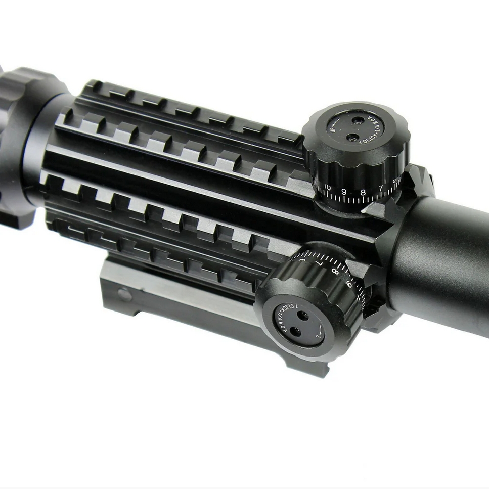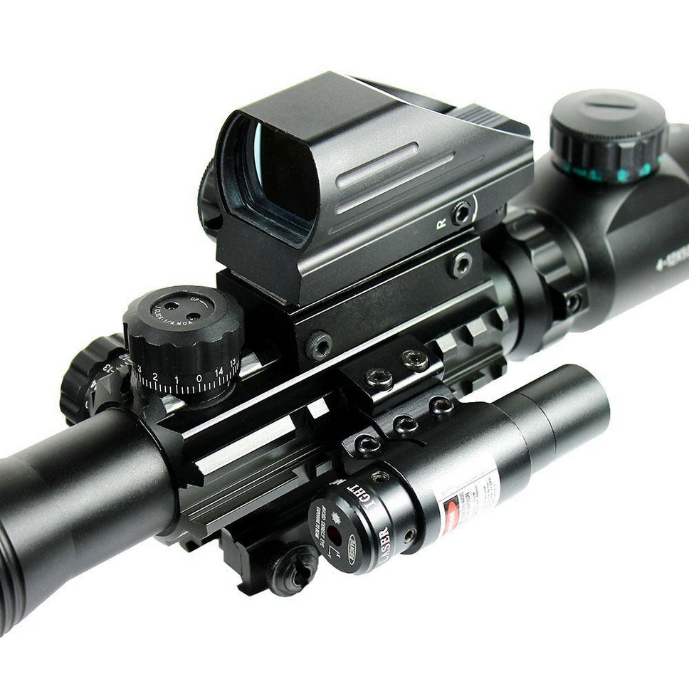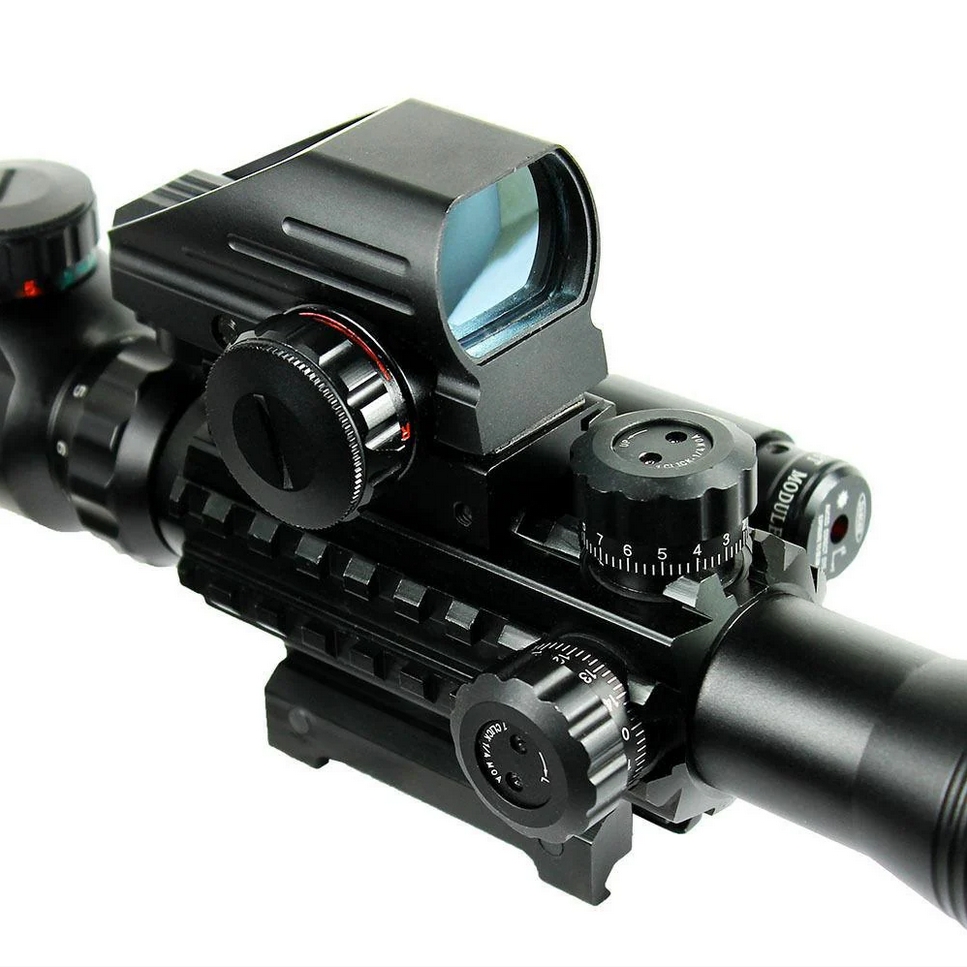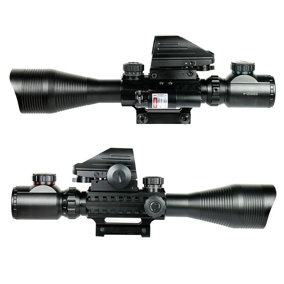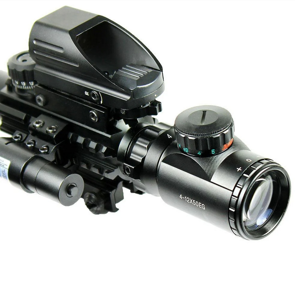 - Zestaw 3w1: luneta 4–12x, kolimator oraz celownik laserowy