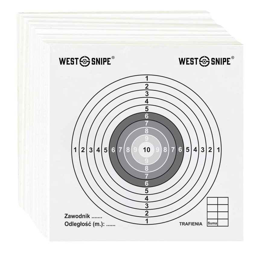 Komplet klasycznych tekturowych sportowych tarcz strzeleckich o wymiarach 140 x 140 mm z ułatwiającym celowanie białym środkiem.
