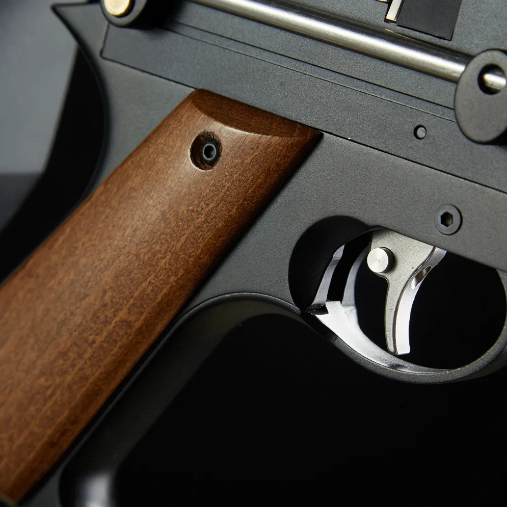 5. Bezpieczeństwo i Komfort: Pistolet wyposażono w bezpiecznik oraz manometr zegarowy, co zapewnia bezpieczne i kontrolowane strzelanie. Dodatkowo, regulacja prędkości początkowej pocisku pozwala na zwiększenie ilości oddanych strzałów z jednego ładowania.
