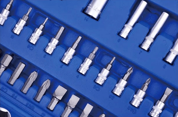 - 43 nasadki 1/4″ i 1/2″ (zwykłe, głębokie, torx), 2 nasadki do świec (16 i 21 mm)