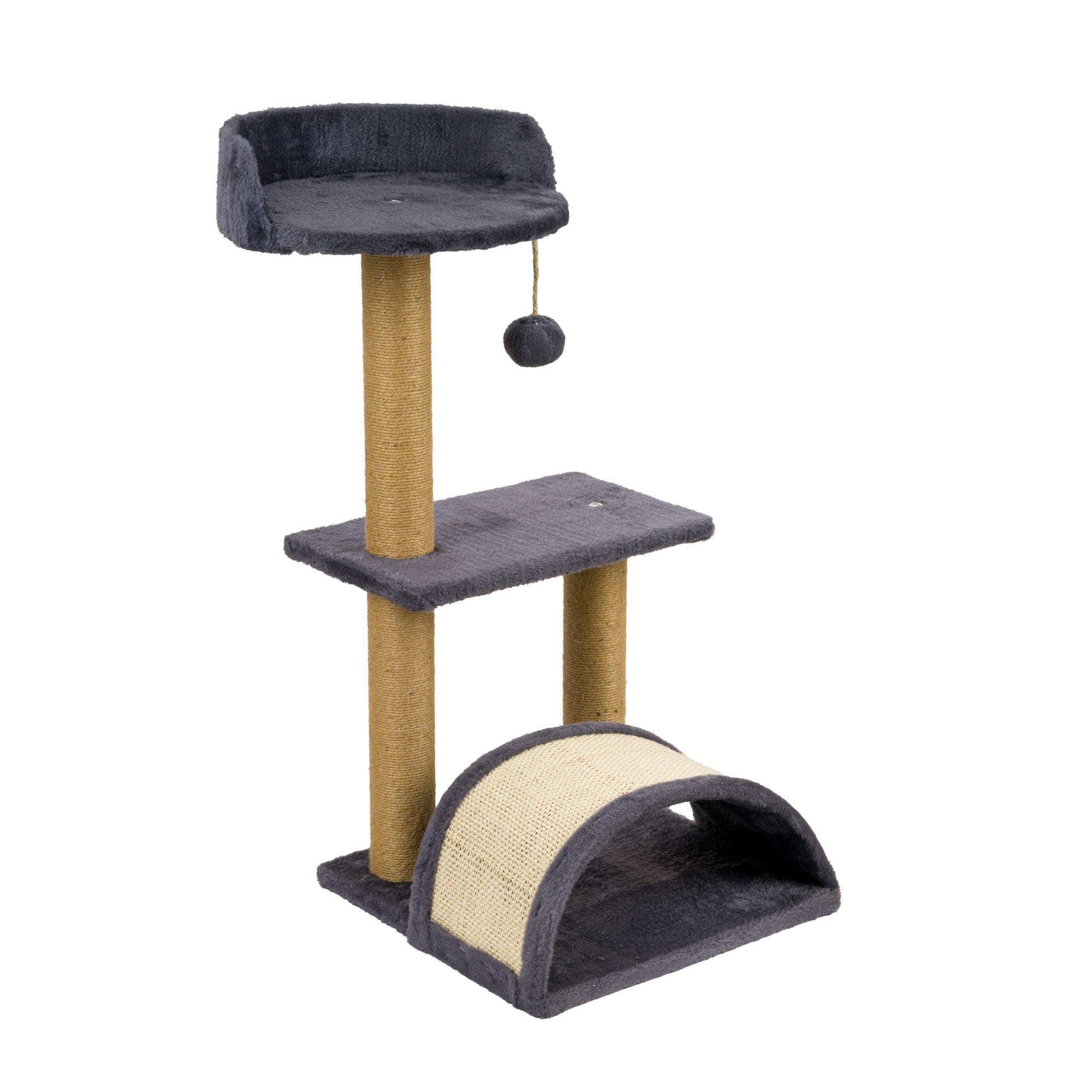 Drapak w formie wieży łączy strefę odpoczynku, drapania i zabawy w jednej konstrukcji. Słupki owinięte sizalem wspierają ścieranie pazurów i pomagają ograniczyć drapanie mebli, a miękkie wykończenie z pluszu zapewnia kotu wygodę podczas drzemki. Tunel w środkowej części urozmaica aktywność, a zabawka na elastycznym sznurku zachęca do ruchu.